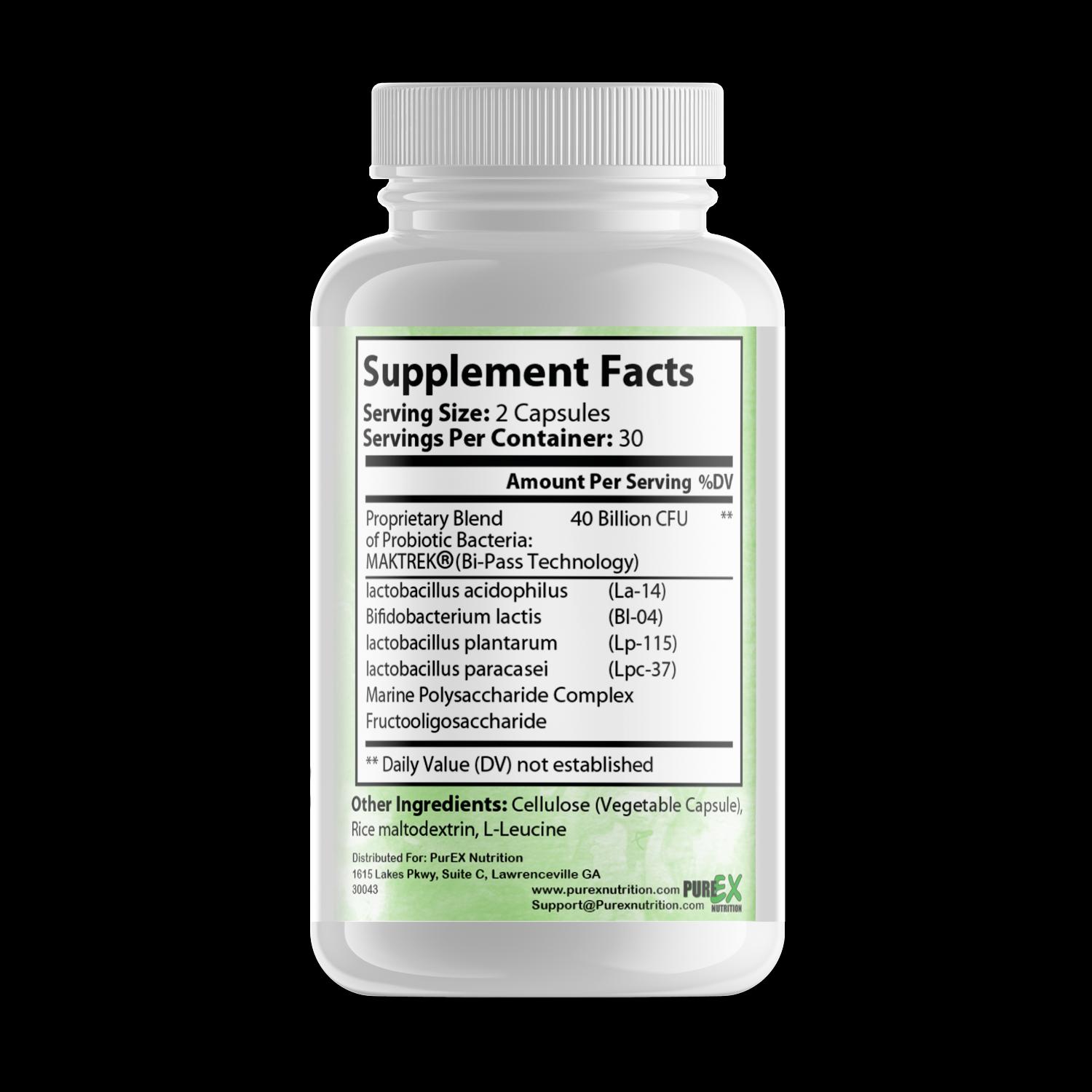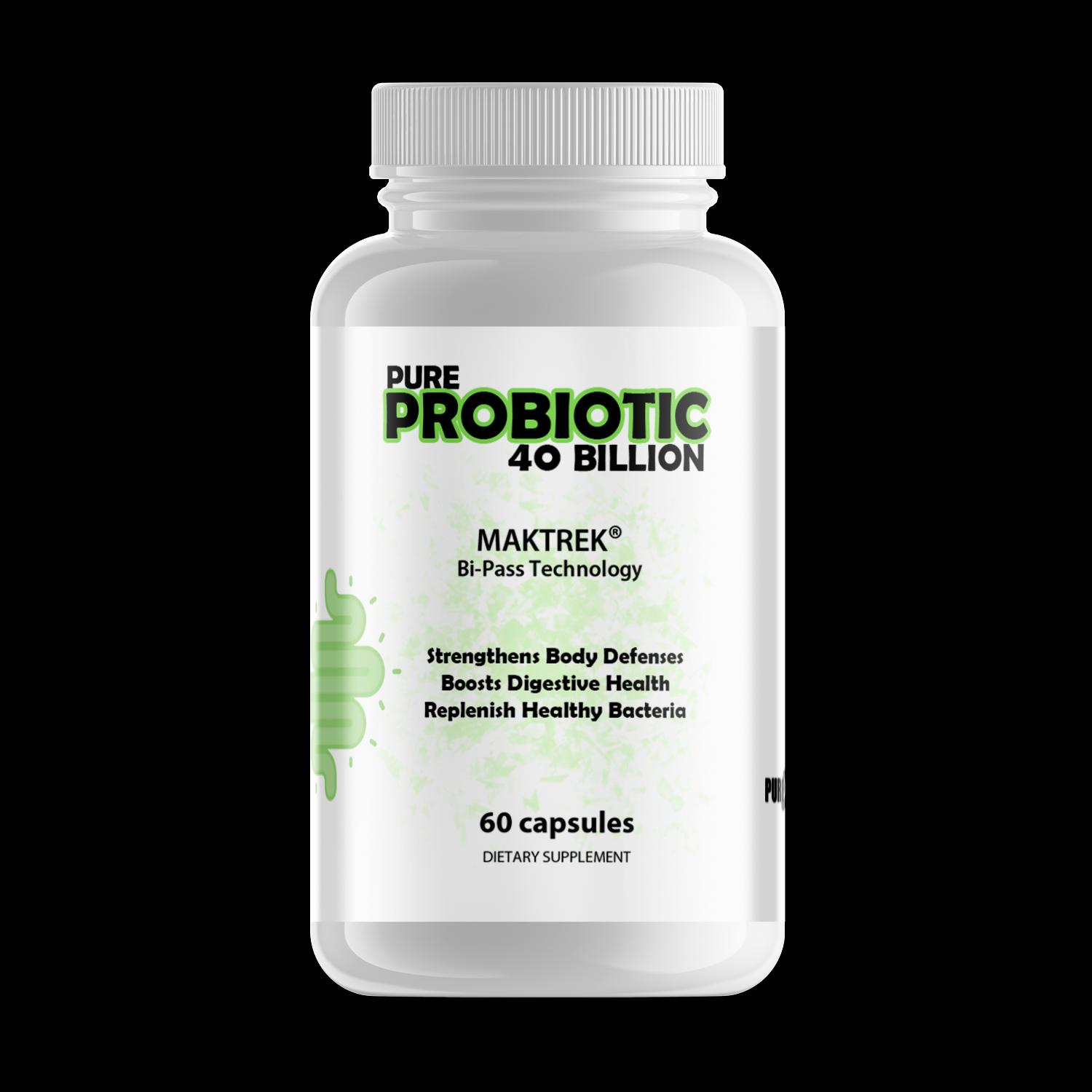 Pure Probiotics contain 40 billion units of colony forming units(CFU) to help improve or balance your microbiota. With MAKTrek Bi-Pass Technology Pure Probiotics is formulated for a higher level of absorption. MAKTrek Bi-Pass Technology is a patented formula that helps to improve the absorption of probiotics specifically within the body. MAKTrek works by protecting the capsule with a protective layer keeping it safe in the stomach. This is so that it isnt broken down early by digestive enzymes in the stomach or intestines.